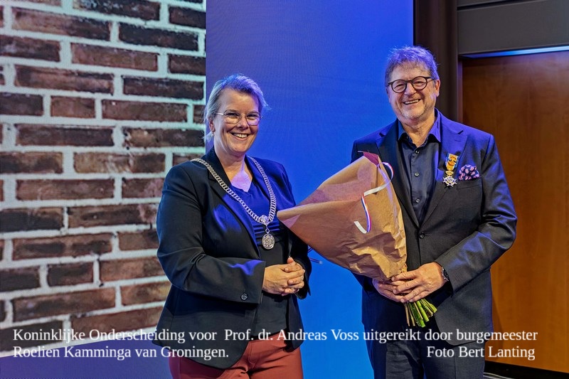 GROESBEEK / Groningen – Op vrijdag 17 oktober kreeg de heer Andreas Voss uit Berg en Dal een Koninklijke onderscheiding. Hij is benoemd tot Officier in de Orde van Oranje-Nassau. Prof. dr. Voss is arts-microbioloog bij het Universitair Medisch Centrum Groningen (UMCG) en hoogleraar transmurale en translationele infectiepreventie aan de Rijksuniversiteit Groningen. Hij kreeg de onderscheiding voor zijn uitzonderlijke bijdragen aan medische microbiologie, infectiepreventie en patiëntveiligheid. Prof. dr. Andreas Voss is opgeleid in Duitsland. Hij verhuisde in 1995 naar Nederland en werkte tot 2021 in het Radboud ziekenhuis en het Canisius Wilhelmina Ziekenhuis in Nijmegen. Sinds 2022 werkt hij in Groningen als afdelingshoofd in het UMCG. Verdiensten Prof. dr. Voss heeft zich op uitzonderlijke wijze ingezet voor de Nederlandse gezondheidszorg. Hij heeft zich decennialang ingezet voor het verbeteren van de infectiepreventie en de veiligheid van patiënten wereldwijd. De verdiensten voortvloeiend uit, maar vaak naast zijn betaalde baan, hebben een brede maatschappelijke uitstraling en zijn van bijzondere waarde voor de samenleving. Er is zelfs sprake is van nationale, Europese en internationale betekenis. Hij heeft zich tijdens zijn hele werkende leven onophoudelijk ingezet voor veilige zorg. Veilige zorg in het kader van het voorkomen van infecties, het werkveld van Infectiepreventie. Hij deed dit nadrukkelijk zowel in de dagelijkse praktijk, als in de vorm van wetenschap, als docent, en als beleidsmaker en bestuurder. Toonaangevende werkgroepen en verenigingen Prof. dr. Andreas Voss heeft meer dan gemiddeld bijgedragen aan toonaangevende werkgroepen en verenigingen in Nederland. Zo was hij bestuurslid van de Stichting Werkgroep Antibiotica Beleid (SWAB) en de Nederlandse Vereniging voor Medische Microbiologie (NVMM). Ook bekleedde hij meerdere functies in expert groepen, bijvoorbeeld vanuit de Werkgroep Infectie Preventie en de Federatie voor Medisch Specialisten. Prof. dr. Andreas Voss was voorts vier jaar programmadirecteur van het European Congress of Clinical Microbiology & Infectious Diseases waar elk jaar 13.000 professionals samenkomen. Twee jaar lang leidde hij binnen de European Society of Clinical Microbiology and Infection Prevention de werkgroep Nosocomial Infections. Tot slot was hij gedurende negen jaar bestuurslid van deze Europese vereniging. Zijn expertise en inzet reikten overigens tot ver buiten Europa. Hij is zeven jaar voorzitter geweest van de International Society of Antimicrobial Chemotherapy. Hij heeft de International Conference for Prevention and Infection Control opgericht en tien jaar lang geleid. Aan de World Health Organization (WHO) heeft hij via drie verschillende programma’s bijgedragen als expert. Ook maakte hij deel uit van het bestuur van het Infection Control African Network. Zijn wetenschappelijke output vulde hij aan met een positie als Editor-in-Chief bij het tijdschrift Antimicrobial Resistance and Infection Control. Duits-Nederlandse samenwerking Prof. dr. Andreas Voss heeft in zijn carrière veel betekend voor de Duits-Nederlandse samenwerking op het gebied van Infectiepreventie. Hij heeft meerdere projecten opgezet, die duurzaam zijn geïmplementeerd. Voorbeelden hiervan zijn het terugdringen van antibiotica resistentie in de grensregio, de preventie van verspreiding van MRSA en kwaliteitsbevordering van infectiepreventie in verpleeghuizen. Outbreak Management Team (OMT) Tijdens de coronapandemie in 2020 deed het RIVM een beroep op Prof. dr. Andreas Voss om deel te nemen aan het Outbreak Management Team (OMT), om het kabinet te adviseren over infectiepreventiemaatregelen in het publieke domein. Daarnaast heeft hij de commissie voorgezeten die de maatregelen voor ziekenhuizen opstelde. Geregeld duidde hij de cijfers en maatregelen in de pers. Met zijn initiatief voor het oprichten van het Samenwerkingsverband Infectiepreventie Richtlijnen is een enorme stap in de goede richting gezet voor een uniform c.q. passend infectiepreventiebeleid in zorginstellingen in Nederland. Pensioen Prof. dr. Voss gaat met emeritaat/pensioen. Dit viert hij met een symposium in het UMCG in Groningen. Tijdens dit symposium kreeg hij de welverdiende Koninklijke Onderscheiding uitgereikt door burgemeester Roelien Kamminga van Groningen Foto: Bert Lanting. ===================================================================