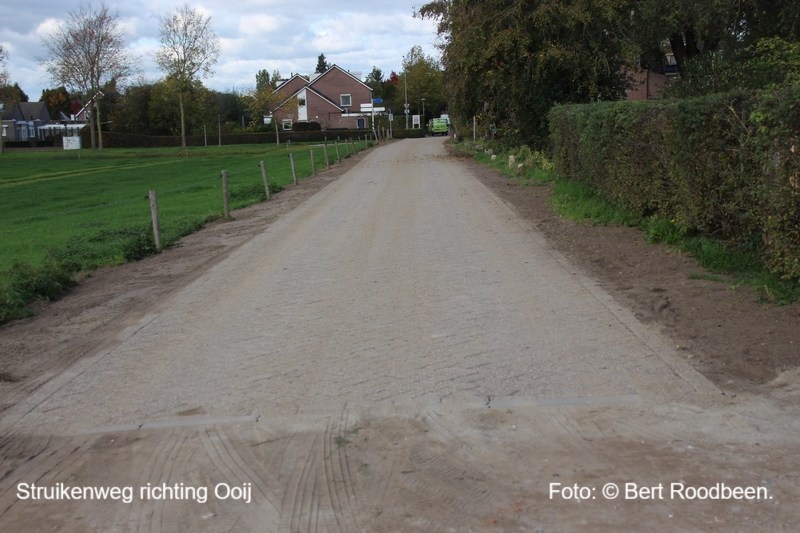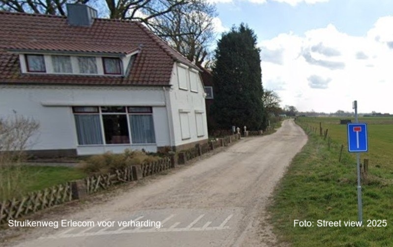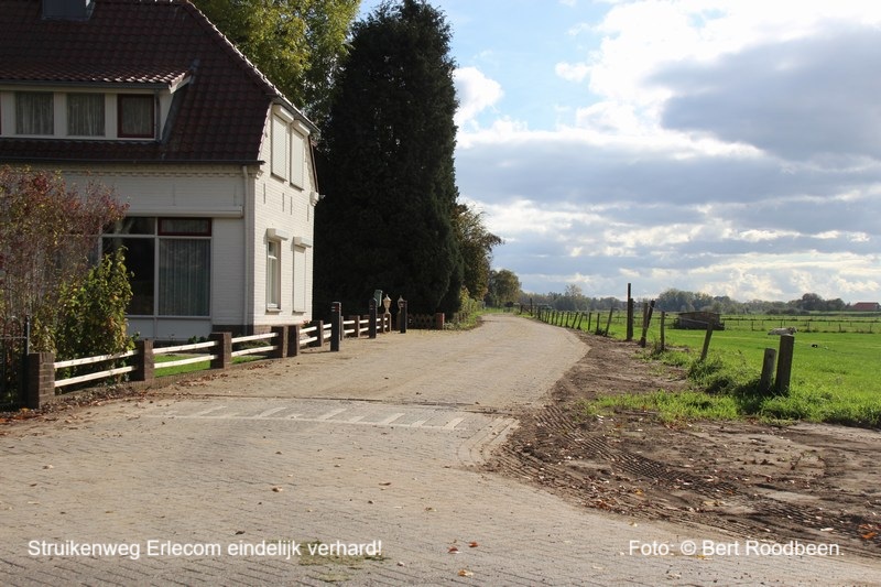 ERLECOM – Decennia lang was de Struikenweg een landweg met kuilen en gaten, maar sinds 10 oktober 2025 hebben de aanwonenden er geen last meer van, trillingen en in de zomer stof happen. De gemeente had i.v.m. duurzaamheid de straatklinkers die i.v.m. herinrichting van het Reiner van Ooilplein e.o. eruit kwamen te bestemmen voor de Struikenweg. Deze werd dan ook gedeeltelijk vanaf de St. Hubertusweg t/m huis nr. 5 met deze (tweedehands) klinkers verhard. Een lang gekoesterde wens van de aanwonende bewoners ging in vervulling, hoewel niet iedereen het hiermee eens was en vond dat de Struikenweg een landweg had moeten blijven. Blijkbaar waren de klinkers/centjes op, want net voor de inrit huis nr. 5 (drie meter) hield de verharding op? Foto: © Bert Roodbeen. ======================================================================