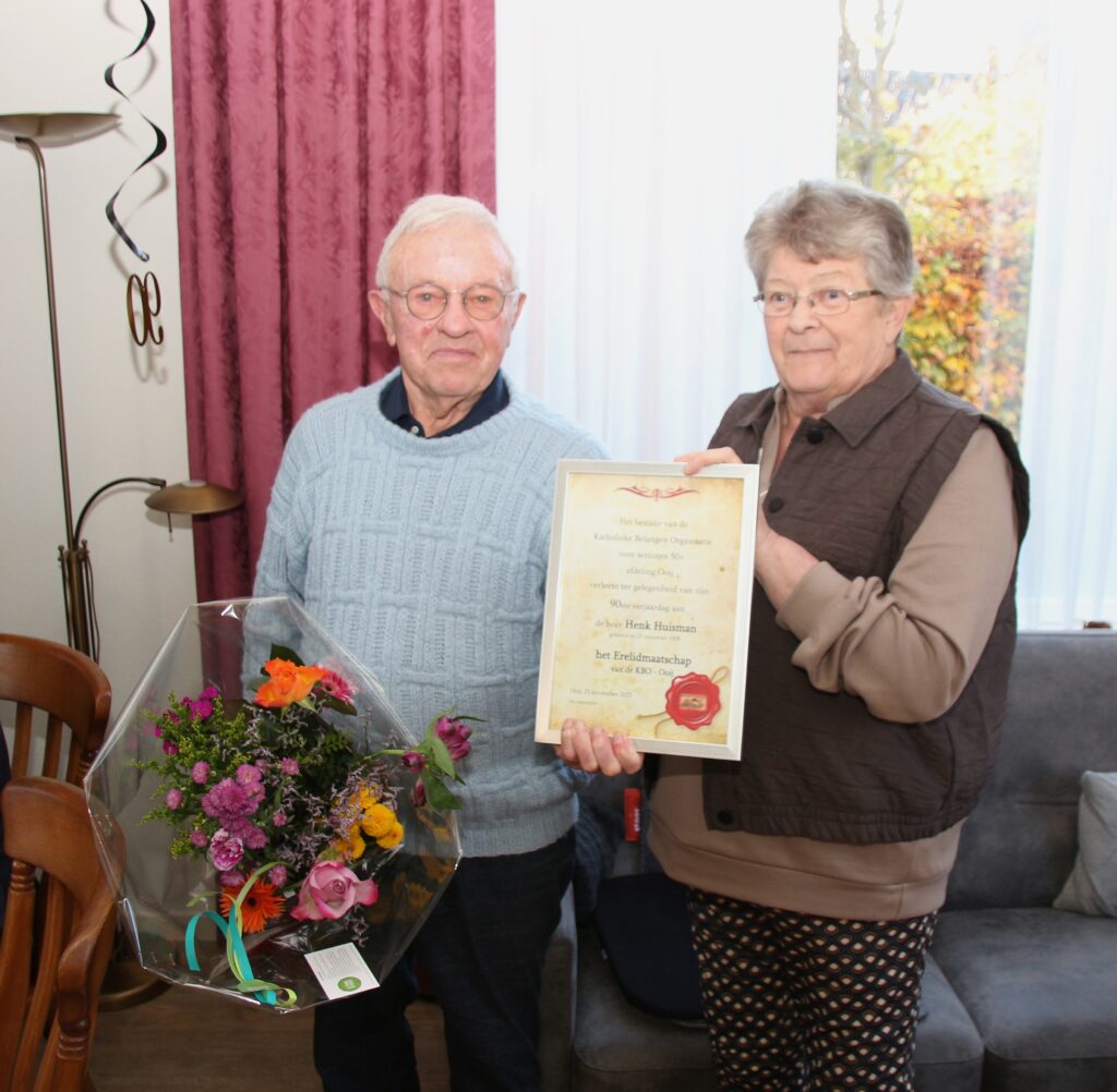 OOIJ – Wanneer je geboren bent op 21 november 1935, bereik je op 21 november 2025 de respectabele leeftijd van 90 jaar. De leeftijd der sterken. Dat was op vrijdag 21 november 2025 het geval met de heer Henk Huisman. Reden genoeg voor het bestuur van de KBO om daar even extra aandacht aan te schenken. Daarom gingen vicevoorzitter Anny Verriet en bestuurslid Bert Roodbeen naar de Irenestraat om Henk in het zonnetje te zetten. Hij kreeg namens de KBO een oorkonde uitgereikt, waarbij hij erelid van de vereniging werd. Natuurlijk werd deze oorkonde vergezeld van een mooie bos bloemen. Henk was zeer aangenaam verrast en nodigde ons uit voor een kopje koffie met een petitfour, met het getal 90 er op. Na even gebabbeld te hebben met de familie, stapten de bestuursleden weer op en wensten hen nog een hele fijne, gezellige avond. Foto: © Bert Roodbeen. ==================================================================