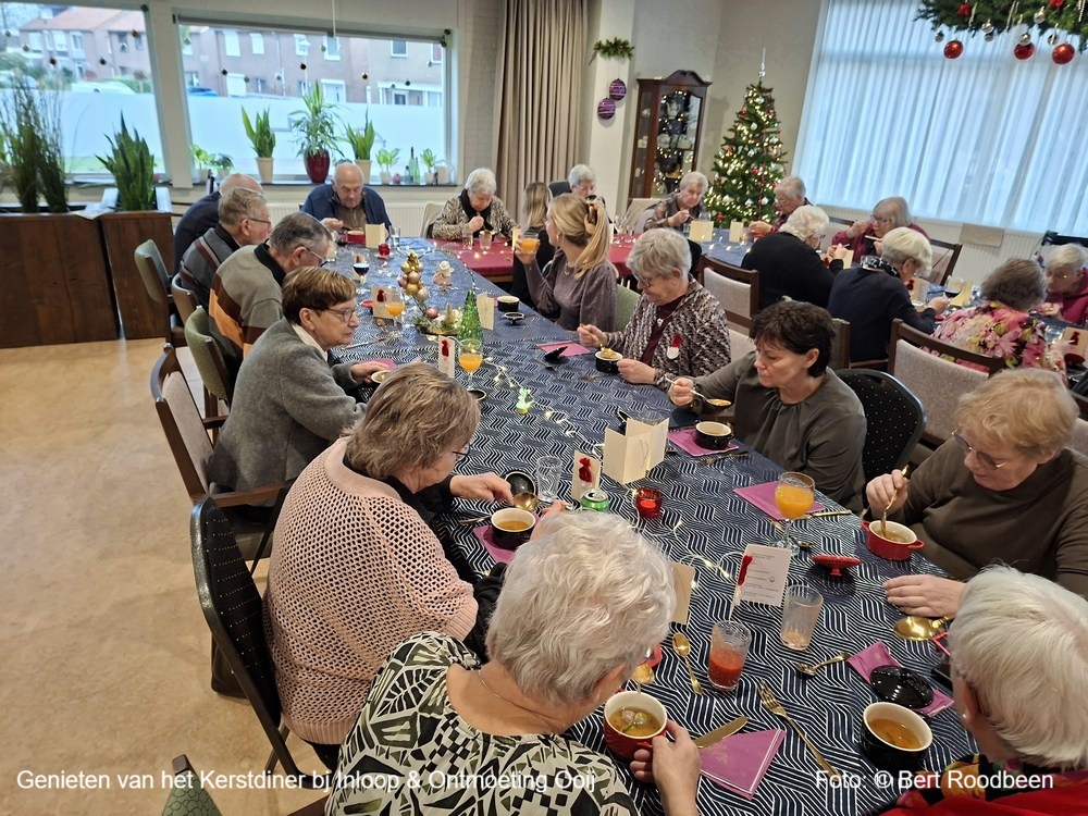 OOIJ – Vrijdag 19 december 2025 werd er in de Polderkamer van dorpshuis “De Sprong”, waar “Inloop & Ontmoeting” haar domicilie heeft, wederom een 4-gangen kerstdiner geserveerd. Ook nu zorgden de lokale kok Jan Drijdijk uit Beek, samen met Sanne van Kalorama en haar vrijwillige medewerkers, dat er voor de gasten een overheerlijke maaltijd op tafel kwam, die overigens net als de ruimte in een passende kerstsfeer was veranderd. Sanne zei in haar welkom dat ze verheugd was dat er zich zoveel deelnemers hadden aangemeld voor deze middag. Diny Arntz-Gerbrands las een passend kerstverhaal voor. Waarna het kerstdiner met een amuse werd geopend. Ook nu ontbrak naast het glaasje wijn of iets anders het advocaatje met slagroom niet. Met voor iedereen een leuke attentie als afsluiting. Een verdiend applaus volgde als bedankje. Ook in de dorpen Beek en Berg en Dal heeft of gaat kok Jan zijn beste beentje voorzetten. Foto’s: © Bert Roodbeen. Kijk HIER ==================================================================