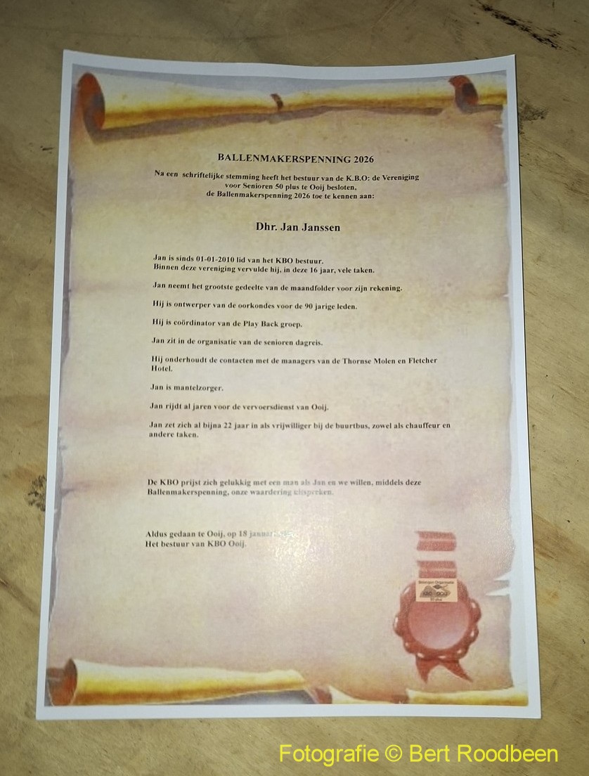 Ook werd de Ballenmakerspenning uitgereikt. Deze ging dit keer naar Jan Janssen, sinds januari 2012 bestuurslid van de Ooijse KBO, waar hij o.a. verantwoordelijk is voor het samenstellen van het maandelijkse verenigingsblad, het mede – organiseren van de dagreis, de Play Back-groep, het contact onderhouden met restaurants voor gezamenlijke maaltijden, rijden bij de Ooijse vervoerdienst, mantelzorger en al 22 jaar vrijwilliger en chauffeur bij en op de Buurtbus. Zijn vrouw Anny nam deze verrassing in ontvangst, Jan kon wegens ziekte zelf niet aanwezig zijn.