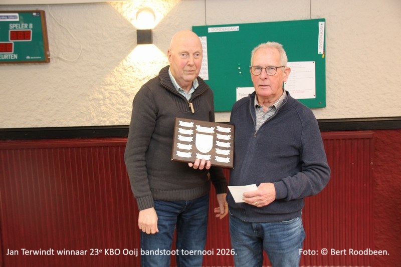 OOIJ – Ook ditjaar was de finale van het 23ste KBO Ooij 50+ bandstoottoernooi spannend. Het 3-daagse toernooi georganiseerd door de biljart- afdeling werd van 10 t/m 12 maart in dorpshuis De Sprong gehouden. In de troost finale speelden Geert Reijnen en Cor Seegers voor de plaats 3 en 4 tegen elkaar. De finale werd gespeeld tussen Herman Leensen en JanTerwindt, de winnaar van vorig jaar, het lukte Herman bijna, maar met slechts 4 caramboles verschil moest hij toch in Jan Terwindt, als winnaar zijn medere erkennen. Einduitslag was: 4e plaats Cor Seegers 17 carb, 3e plaats Geert Reijnen 33 carb, 2e plaats Herman Leensen 15 carb en plaats 1e Jan Terwindt en winnaar wisseltableau.met 19 caramboles.Een bedankje is op zijn plaats voor de scheidsrechters, Herman Leensen,Ton Driessen en Wout Meijer voor het drie dagen bijhouden van de partijen en scores. Foto’s: © Bert Roodbeen. Kijk HIER =================================================================