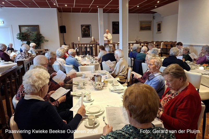 BEEK – Donderdagmiddag 2 april was de dag voor onze paasviering in hotel `t Spijker. Om 15.00 uur begon de eucharistieviering waarin de Eerwaarde Heer Bomers voorging geassisteerd door de heer Paul Spijkerman. De preek was ook deze keer weer zeer innemend. De KBO-singers ondersteunde deze viering met fraaie zang. Tijdens de viering was er een collecte voor de minder bedeelde in onze gemeente Coby en Gerard gingen met een mandje rond. Na de H.Mis werd een consumptie naar keuze geserveerd aan onze leden en werden er lootjes verkocht voor onze fantastische loterij, bij ons geen inflatie, nog steeds 10 loten voor maar € 5,00. Coby had bij onze sponsors weer bijzonder fraaie prijzen los gekregen, ieder jaar weer een hele klus voor haar, die zij steeds weer met verve vervult. Graag een bedankje aan onze sponsors wanneer u uw prijs komt ophalen, maakt het voor Coby volgend jaar weer makkelijker, bij voorbaat hartelijke dank. Nadat de vele bijzonder mooie prijzen uitgereikt waren, werd het tijd voor de gemeenschappelijke broodmaaltijd met diverse (paas)broodsoorten en beleg, het paaseitje, zoetwaren, werden ook deze keer aan tafel uitgeserveerd, een lust voor het oog, natuurlijk ontbrak de befaamde kroket niet, evenals koffie en thee. Alles voorafgaand door een heerlijke kop asperge soep. Weer een bijzonder geslaagde middag was de mening van alle aanwezigen.