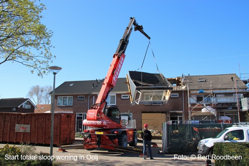 OOIJ – Bijna zes maanden na de rampzalige brand november vorig jaar in een woning aan de Prinses Christinastraat, zijn slopers op 8 april begonnen met het slopen van het gehele pand. Met een verreiker werden de eerste grote dakkapellen gesloopt. Na dat de naast liggende panden gestabiliseerd en weerbestendig zijn gemaakt gaat de totaal sloop verder. De werkzaamheden worden uitgevoerd door het bedrijf Vakslopers uit Nunspeet en zullen ongeveer twee weken duren. Zie foto’s: © Bert Roodbeen. e.a. Kijk HIER ( komen meer)